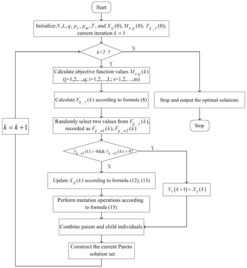 The first phase was primarily composed of Pareto-based optimization and non-Pareto-based optimization. One of the typical algorithms not based on Pareto dominance was VEGA, which partitioned the population of size P to r sub-populations and each sub-population evolved for different sub-objectives respectively. The superiority of VEGA was that the operation was simple and could be implemented easily, but it was hard to obtain the optimal solution set when the true Pareto Front was non-convex. The other branch was the Pareto-based approach, which was first put forward by Goldberg [] in 1989 and introduced the Pareto Rank mechanism to implement the operation of selection. The Pareto-based algorithms mainly include Niched-Pareto Genetic Algorithm (NPGA) [] proposed by Horn and Nafpliotis, Multi-objective Genetic Algorithm (MOGA) [] proposed by Fonseca and Fleming, and so forth. However, the Pareto-based approach is not universal and it is necessary to choose a method to maintain the diversity of the solution set based on specific optimization problems.