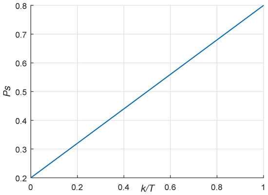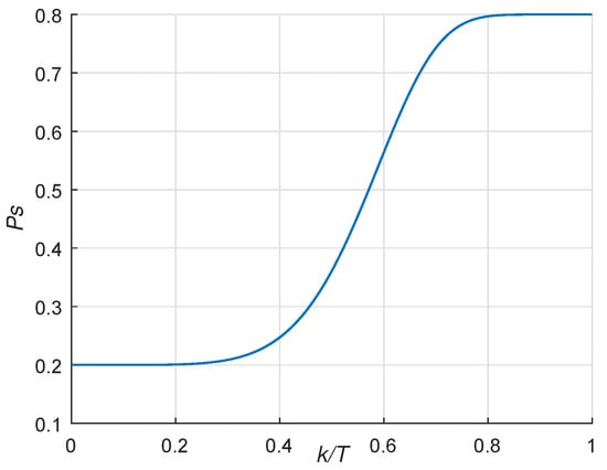 From Equation (12), we can see that large is inclined to exploitation, while small is inclined to exploration. In order to enhance the convergence and flexibility of the proposed algorithm, the value of the probability is not fixed but changes dynamically according to the current iteration number. The variation pattern of with the iteration number is shown in Figure 4. In the initial stage of population evolution, since it is expected that the individuals can converge to the optimal solutions quickly, we assign a small value to so that individuals tend to find updated solutions in the global scope. As the number of iteration increases, we hope to find optimal solutions which are more diverse and distributed, so the value of gradually increases, making individuals tend to perform local search. In this way, the search range of the solutions is dynamically selected according to the phase of evolution, so that the individuals can quickly and effectively approach the best optimal solution set. We define the calculation of as follows: