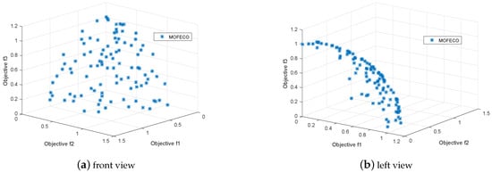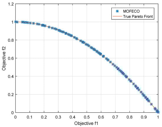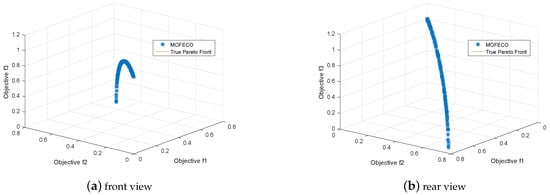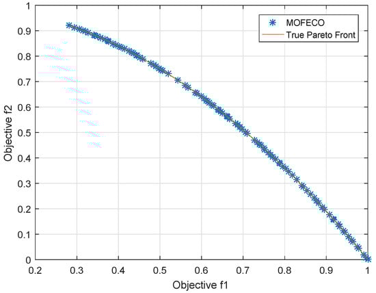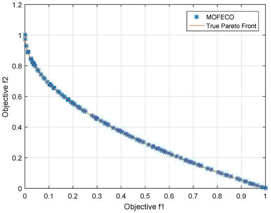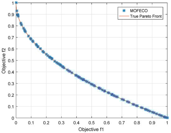 where represents the minimum Euclidean distance between the obtained solution and the solutions in , and is the number of the obtained optimal solutions. measures how far these non-dominated solutions X are from those in the true Pareto optimal front . The smaller the value, the closer the Pareto solution set is to the real Pareto frontier and the better convergence the solution set has. If , the solution set is on the real Pareto front, which is the most ideal situation.