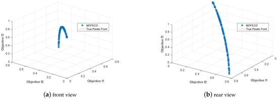 From Figure 6, Figure 7, Figure 8, Figure 9, Figure 10, Figure 11, Figure 12, Figure 13, Figure 14, Figure 15, Figure 16, Figure 17, Figure 18, Figure 19, Figure 20, Figure 21, Figure 22, Figure 23, Figure 24, Figure 25, Figure 26, Figure 27, Figure 28 and Figure 29, we can see that the obtained Pareto front by using the proposed MOFECO can evenly distribute on the true Pareto front, which shows that the algorithm can converge to the optimal solution set and is effective in solving MOO problems.