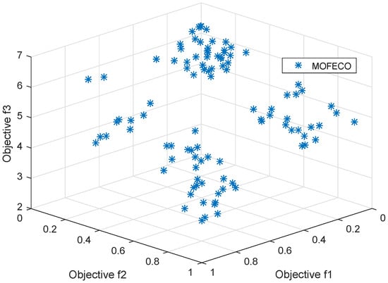 According to FECM, proposed in Reference [] and from the expression of solutions in the previous section, we know that the update of individual depends on the corresponding forces . From the perspective of system balance and Equation (6), the smaller is, the larger is, and since larger force will make the element stronger, so that each element will further converge. Therefore, we can infer that if has a positive value, is a good solution. In this situation, should be reserved. Nonetheless, in MOO problems, the individual corresponds to multiple objective function values, that is, corresponds to multiple forces . If we reserved when all have positive value, there are almost no remained individuals. In evolutionary algorithms, however, we usually want to retain 10% to 20% of the current population as the reserved solutions. So, in MOFECO, we update as follows: