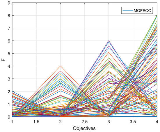 The values are used to measure the diversity of the Pareto solution set. Generally speaking, large values represent good diversity of solution sets. It can be seen from Table 17 that MOFECO can obtain the largest values on at least 10 test functions compared with the other five algorithms, particularly, it achieves a good performance on all the four ZDT test problems with two objectives in terms of . While on the five DTLZ test functions, the PD values obtained by MOFECO on DTLZ2 and DTLZ7 are slightly worse than those obtained by NSGA-II and MOPSO. But on all the five DTLZ test problems, MOFECO can show good performance compared with KnEA and NSLS. Among the four-objective test functions (WFG2, WFG3, WFG4, MaF1, MaF2 and MaF12), MOFECO can achieve the largest values except for WFG3 compared with NSGA-II, MOPSO, PESA-II, KnEA and NSLS. From those empirical results, we can confirm that the proposed MOFECO algorithm is promising in solving MOO problems, and it has advantages in maintaining the diversity of obtained Pareto solution sets, because of its novel characteristics, such as dividing the population into several independent cycles, relating the new solutions generated in the update process to the optimal solution in each cycle, and the differences in the optimal solutions obtained between different cycles, etc.