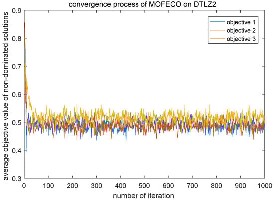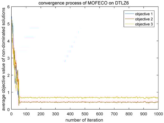 In order to more visually show the performance of the MOFECO algorithm, a detailed convergence process increasing the number of iterations is discussed. Here we choose two test problems DTLZ2 and DTLZ6 to show the convergence process. Experimental results are shown in Figure 30 and Figure 31. The abscissa represents the number of iterations and the ordinate represents the average objective function value of the non-dominated solutions in each iteration.