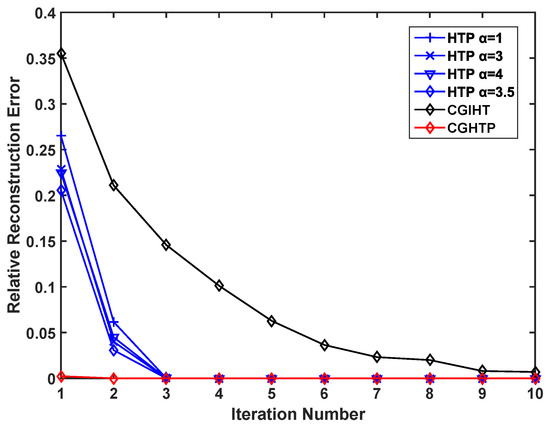 In this section, we verify the performance of the proposed algorithm by Gaussian-signal reconstruction experiments and real-world images reconstruction experiments. This section compares the reconstruction performance of HTP (with several different step sizes), CGIHT, and CGHTP with parameter . All experiments are tested in MATLAB R2014b, running on a Windows 10 machine with Intel I5-7500 CPU 3.4 GHz and 8GB RAM.