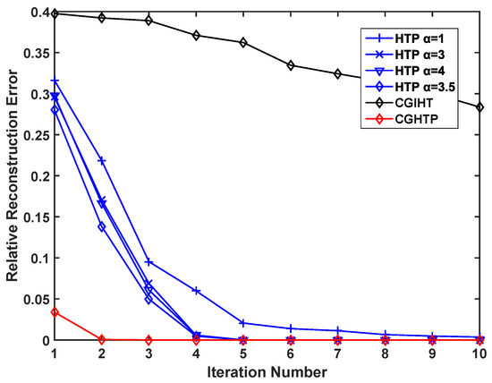 Figure 7, as the number of iterations increases, the relative reconstruction errors of the signals reconstructed by HTP and CGHTP decrease, and becomes stable at a certain error value where the convergence is reached. However, the relative reconstruction error of CGIHT algorithm decreases very slowly with the increase of iteration times.