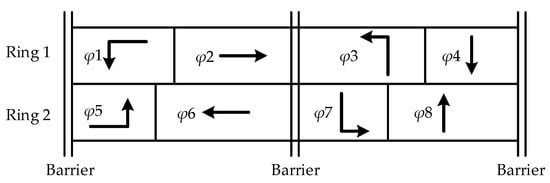 Then, considering the duration of two barrier groups in each ring, these should be equal to the current decision variable Equation (9). In addition, the duration of each phase is bounded by a lower limit and an upper limit which is shown in Equation (10).