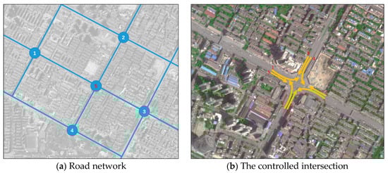 As shown in Figure 4, there is an actual road network in Chengdu, China, which has a typical grid structure. Geometric data were collected in the field to reflect real conditions and were further modeled into the microscopic simulation software Vissim []. Of the five intersections in total, one of those intersections, which is marked 5 in Figure 4, was chosen as the testing intersection for the proposed control system. The area surrounding the intersection is necessary for traffic flow prediction model [] and to ensure realistic traffic flows. Full-actuated control was applied to all the other intersections. As a reasonable simplification, no right-turn traffic was modeled in this study, and only straight and left-turn traffic flow were modeled.