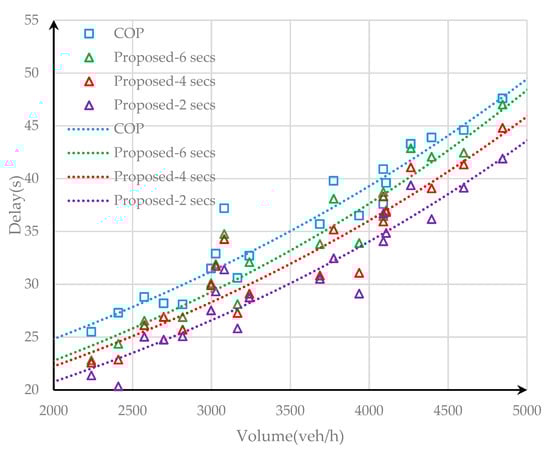 As shown in Table 2, Table 3 and Table 4, the reduction of average delay is observed for all phases. For the studied intersection, the proposed control method reduced the average vehicle delay in each phase, compared with the COP algorithm. The results show that the proposed method was able to reduce both total vehicle delay of the intersection and for each phase. In addition, the reduced average vehicle delay was as much as 17.95%, 12.32%, and 11.78%, respectively, when the traffic volumes were 2500, 3500, and 4500 veh/h.