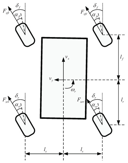 - Xiong, L.; Yu, Z.; Wang, Y.; Yang, C.; Meng, Y. Vehicle dynamics control of four in-wheel motor drive electric vehicle using gain scheduling based on tyre cornering stiffness estimation. Veh. Syst. Dyn. 2012, 50, 831–846. [Google Scholar] [CrossRef]