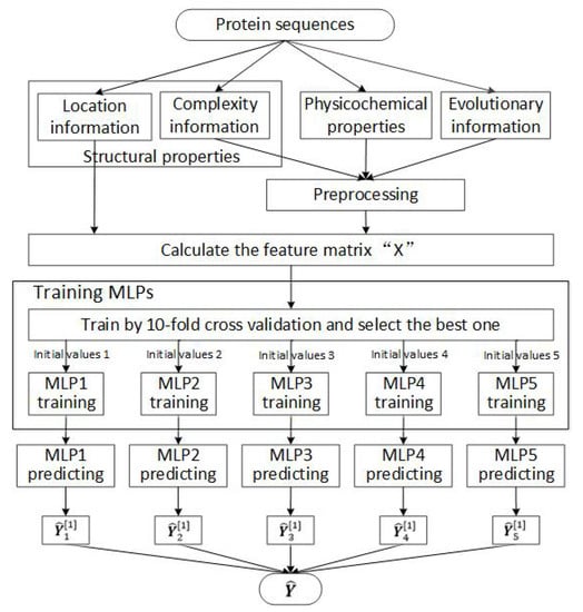 The detail paradigm of our scheme is shown in Figure 2. Based on the feature matrix , we use 10-fold cross validation to train MLP networks, and select the best one according to their prediction results. Then, to reduce the impact of initial values, five different random initial values are used to train five independent MLP networks. Finally, the prediction results are obtained by averaging the outputs of these five trained MLP networks.