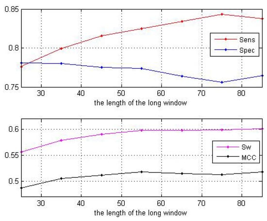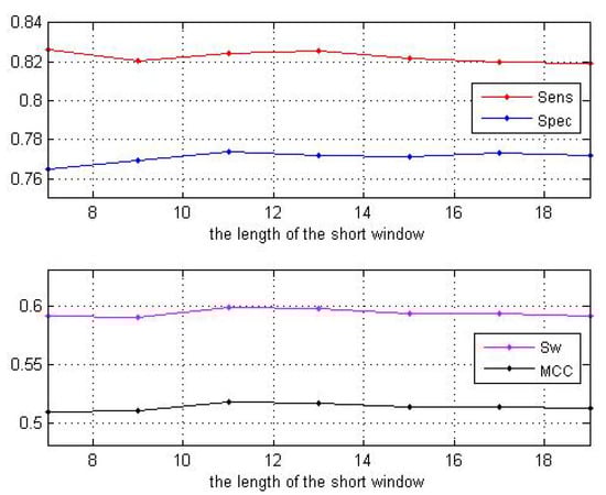 When the size of the long window is larger than 55, the curves of the two parameters and tend to be stable as shown in Figure 3. Thus, we set the size to be 55. Next, fixing the size of the long window at 55, we change the size of the short window. The predictive performance is shown in Table 2 as well as Figure 4. These results show that our choice of window size 11 is acceptable.