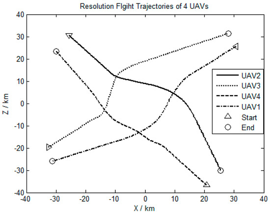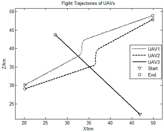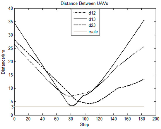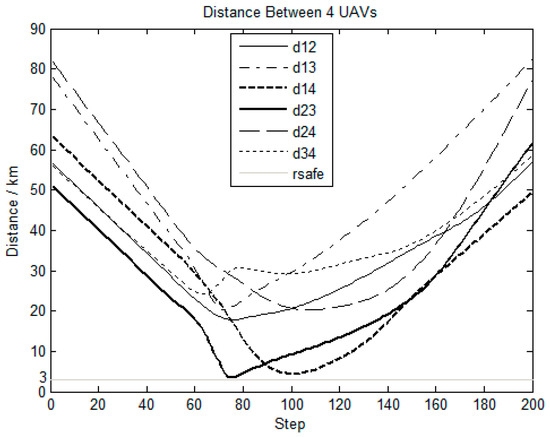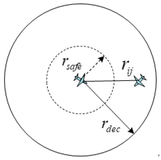 - Collision avoidance constraintDenote the safe flight radius of UAV as , if the distance between any two UAVs () is less than , these two UAVs are considered to collide [17]. So at kth time, the collision avoidance constraint can be given as below: