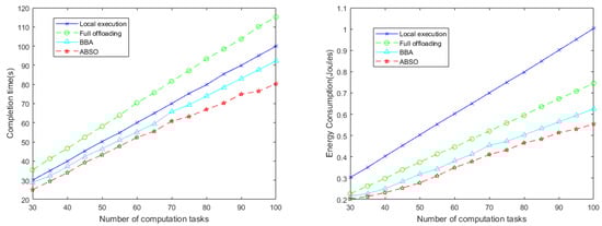 We observe the energy consumption of mobile devices and the completion time of tasks under various quantities of computation tasks in Figure 4. Obviously, we can see that the completion time and energy consumption will gradually increase as computational tasks increase. We can see that local execution consumes the most energy, because the CPU computation capacity of a mobile device is relatively small. Also, full offloading has higher completion time compared to others; this can mainly be attributed to the reason that full offloading needs to transmit data to the edge cloud before tasks can be processed. Moreover, it can be observed that the presented offloading strategy has better results compared to others on decreasing the expenditure of energy and time, and as the number of tasks increases, its advantages become more obvious. For the metric of the completion time, ABSO can achieve up-to 14% and 26%, and 7% performance improvement over the local execution, full offloading, and BBA, respectively. For the metric of the energy consumption, ABSO can reach up to 42% and 22%, and 9% decrement of energy compared to the local execution, full offloading, and BBA, respectively.