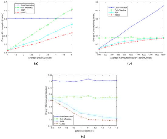 In Figure 5c, we consider the energy consumption as the variance of latency requirements. The energy consumption of local computing and full offloading is little changed. This is because that latency requirements are not taken into account when processing locally and offloading entirely, and energy consumption is independent of latency requirements. Obviously, offloading tasks to the edge cloud is helpful to cut down energy consumption. While tasks’ delay deadlines are small, the performance of our proposed ABSO resembles full offloading and BBA. Since most tasks are offloaded to the edge cloud for processing. It seems the energy consumption of ABSO is plunged and tends to be gentle after 1.1 s. This is because that as latency turns larger, the presented ABSO uses an optimized strategy, in order that the energy consumption can be reduced slightly.