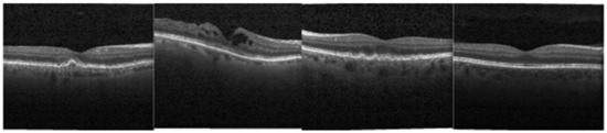 In ophthalmology, one of the most commonly used integral imaging techniques is spectral domain optical coherence tomography (SD-OCT), with approximately 30 million OCT scans performed each year worldwide [7]. OCT is a non-invasive imaging technique, which captures cross-sectional images at microscopic resolution of biological tissues [8]. By providing a clear cross-sectional representation of the retinal pathology in these conditions (Figure 1), OCT is critical to the early identification and treatment of retinal pathologies today. Examples in Figure 1 are picked from a public dataset provided by [9].