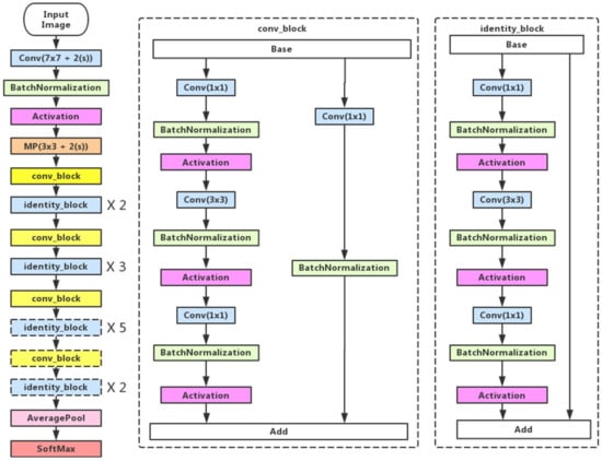 ResNet is another representative deep network. Before ResNet, the state-of-the-art DNN was going deeper and deeper. However, deep networks are hard to train because of the notorious vanishing gradient problem—as the gradient is back-propagated to earlier layers, repeated multiplication may make the gradient infinitively small. By introducing a skip connection (or shortcut connection) to fit the input from the previous layer to the next layer without any modification of the input, ResNet can have a very deep network of up to 152 layers. The architecture of ResNet50 is shown in Figure 3.