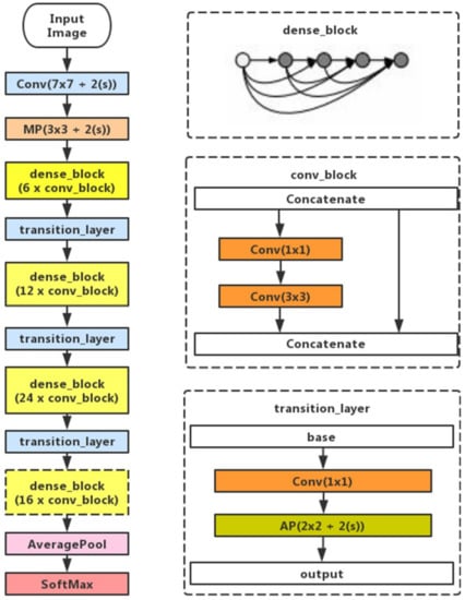 There are three kinds of blocks in the DenseNet implementation. The first is convolution block, which is a basic block of dense block. Convolution block is similar to the identity block in ResNet. The second is dense block, in which convolution blocks are concatenated and densely connected. Dense block is the main component in DenseNet. The last is transition layer, which connects two contiguous dense blocks. Since feature map sizes are the same within the dense block, transition layer reduces the dimensions of the feature map. The technique of bottleneck design is adopted in all the blocks. The architecture of DenseNet121 is shown in Figure 4.