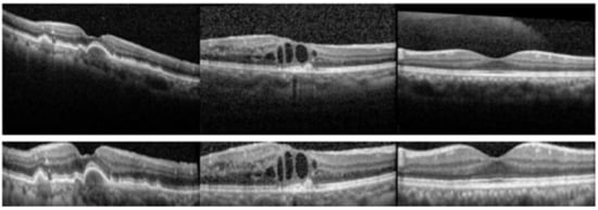 The small-scale retinal OCT dataset is obtained from clinics in Beijing hospital, using CIRRUS TM (Heidelberg Engineering Inc., Heidelberg, Germany). This dataset consists of 560 AMD, 560 DME and 560 normal (NOR) images. All the SD-OCT images are read and assessed by the trained graders. We first preprocessed these images using the preprocessing method in [14] which is mainly divided into three stages. (1) In the perceiving stage, the method detects the overall morphology of a retina. Firstly, the sparsity-based block matching and 3-D-filtering (BM3D) denosing method [34] is used to reduce noises of the OCT image, then the binarization, median filtering, morphological closing and morphological opening methods are used to obtain the subject of the image. (2) In the fitting stage, the method automatically chooses the set of data points and a fitting method (linear fitting or second-order polynomial fitting). (3) In the normalizing stage, the method normalizes the retinas by aligning them to a relatively unified morphology and crops the images to trim out insignificant space. Some examples are shown in Figure 5.