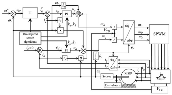 Obtaining the gains of the three PI controllers that make up the speed control scheme occurs based on simulations developed in the Matlab environment, where the different heuristics and the dynamic model of the PMSM described by the differential Equations (1)–(3) are integrated.