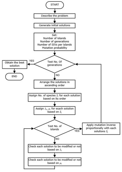 The fitness function FF is associated with each solution of Biogeography-Based Optimization BBO, which is analogous to HSI of a habitat. A good solution is analogous to a habitat having high HSI and a poor solution represents a habitat having a low HSI. The best solutions share their geographies of the lowest solutions throw migration (emigration and immigration). The best solutions have more resistance to change than the lowest solutions. However, the lowest solutions have more change from time to time and accept many new features from the best solutions. The immigration rate and emigration rate of the j-th island may be formulated as follows in Equations (28) and (29) [22].
