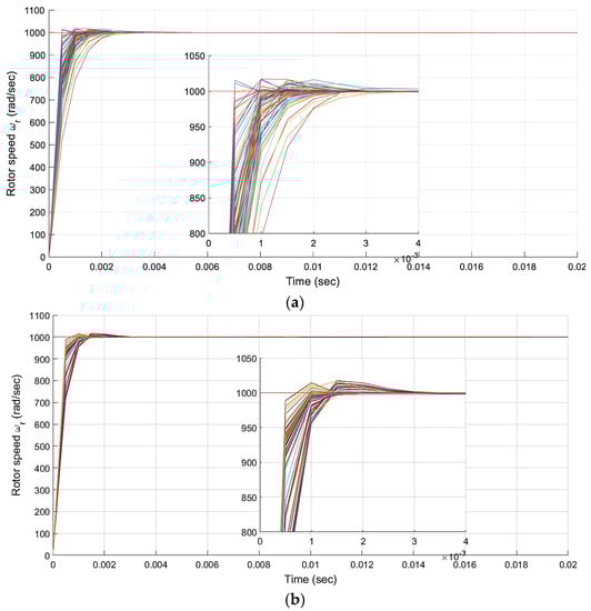 The motor parameters used in the simulation are contained in Table 1. While the graphs in Figure 7 show the behavior of the system using the different algorithms, feeding with a step (1000 rad/s), and under constant load torque (1 Nm).