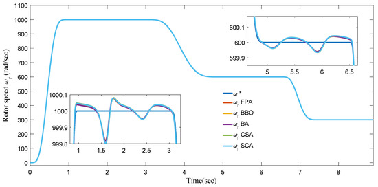 Figure 8 show the speed tracking of all algorithms for case 1, where there is an error in steady state less than 0.001% of the nominal reference value, it can be observed that the different algorithms achieve the appropriate tracking of the desired speed profile. The absolute error is shown in Figure 9, being the maximum error of just 0.9 rad/s, being the BBO the algorithm that gives the least error and CSA the one that gives the greatest error.