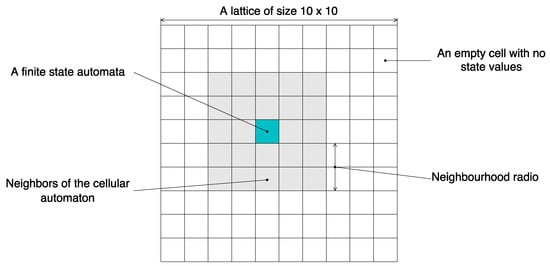 Figure 1 describes in detail a lattice of n×n (10 × 10 cells), with a cellular automaton in the position x,y (5,5). The number of cells in the Moore neighborhood of range is the odd squares .