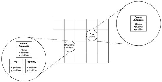 There are two types of cellular automata: predators (buffaloes) and prey (grasslands). Predators are those who use the behavior of ABO metaheuristic. They have been designed in such a way to support an extra group of variables (see Figure 4, left). Prey are those that use the behavior determined by the prey–predator dynamic model rules (see Figure 4, right).