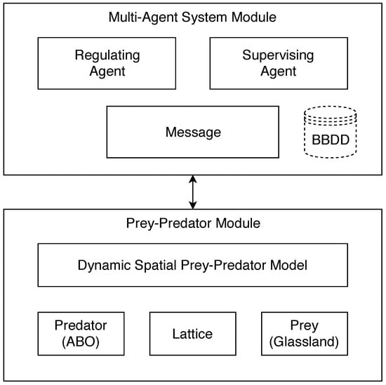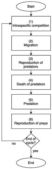 Mathieu et al. [47] reviewed environment updating and agent scheduling policies in agent-based simulators that examine the purpose of observing the sensitivity of the parameters in the implementations of simulators based on agents. They considered upgrading the environment and agent scheduling policies. A distribution based on the environment and the other on the agents is studied in [48]. This research has shown that some types of applications are more suitable for one type of distribution than others. In the experiments, using flocking and prey–predator models is considered. A stochastic scheme to model an artificial prey–predator ecosystem of several species to study the influence of energy flow on the useful life and stability of the ecosystem is investigated in [49]. In [50], the authors applied a computer model based on ecosystem agents to predict the interactions of competition and predation. Cyclic competition and percolation in grouping predator–prey populations is reviewed in [51]. It shows that the properties of the Lett–Auger–Gaillard spatial model when different strategies coexist. These can be understood through the geometric behavior of clusters involving four effective strategies that compete cyclically, without neutral states.