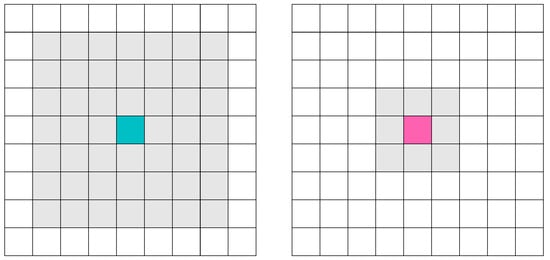In a two-dimensional cellular automaton, the Moore neighborhood is often used. It comprises the cell to evolve and its eight nearest neighbors. It can be generalized as the d-dimensional neighborhood defined in Equation (3).