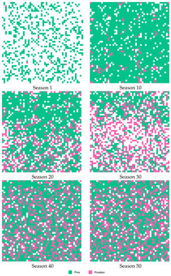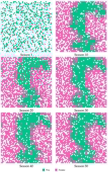 Figure 8 and Figure 9 describe the behavior of Case E, showing the lattice in six stages of the simulation (Seasons 1, 10, 20, 30, 40 and 50). When considering behavior without using the agent (see Figure 8), was found that prey kept in the central sector of the lattice, and predators on both sides of the prey. However, when considering the behavior using agents (see Figure 9), the population of prey and predators were distributed throughout the space of the lattice.