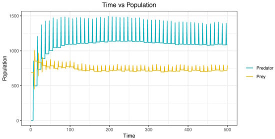Considering these results, we observed that, when increasing the value of the parameters and , there is no change in the amount of prey or predators in the model. However, the use of agents allowed the autonomous regulation of the population of prey and predators in the model. We could easily account for this interpretation because the range of prey was between 1489 and 1494, and predators between 871 and 878, which are discrete ranges with a differences of five prey and seven predators. This difference was compared with the experiment without using agents, where the ranges of the prey were between 80 and 505, and of the predators between 1243 and 1364 giving a discrete range of 425 prey and 121 predators.