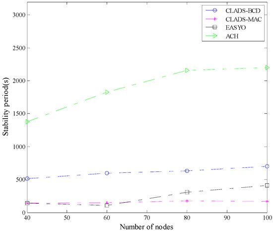 The stability period is defined as the time duration from the establishment of the network to the death of the first node [24]. The stability period is crucial for the applications which require the feedback from the sensor network to be reliable [22]. In Figure 1, the stability periods of different schemes are compared. It can be seen that the stability period of ACH was the longest. The stability period of CLADS-BCD was longer than that of CLADS-MAC and EASYO. Therefore, in backpressure-style schemes, CLADS-BCD makes the network more stable than CLADS-MAC and EASYO. In wireless sensor networks, the energy of the nodes around the sink node can easily be exhausted, which limits the stability periods of WSNs. Under ACH, in each cluster-setup round, the nodes with more residual energy can be chosen as the cluster heads with higher probabilities, and this can balance the energy consumption of nodes around the sink node. Therefore, networks under ACH had the longest stability periods. CLADS-BCD, CLADS-MAC, and EASYO all consider residual energy states of nodes in scheduling to balance energy consumption. In the CLADS schemes, distance coefficients for energy queues are applied to reduce the energy consumption of nodes around the sink node, and this leads to longer stability periods under CLADS-BCD than under EASYO. The reason why the stability periods under CLADS-MAC were the shortest is that CLADS-MAC adopts a distributed media access control scheme in scheduling, obtaining sub-optimal transmission link sets.