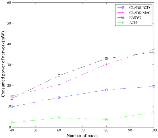 The consumed powers of the network under different schemes are compared in Figure 2. Figure 2 shows that the consumed power of the network under cluster-based ACH was the lowest. Figure 2 also shows that the consumed power of the network under CLADS-BCD was lower than those under EASYO and CLADS-MAC. The reason is that TDMA scheduling was adopted in each cluster, which effectively reduces consumed power. Unlike EASYO, in CLADS-BCD, queues were normalized in a Lyapunov function to unify the dimension of the queues, which led to more valid weights of the energy queues in the framework, and a reduction in consumed power. The transmission link sets obtained by the distributed media access control scheme in the scheduling of CLADS-MAC were sub-optimal, and this increased the consumed power of the network.