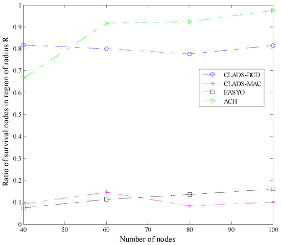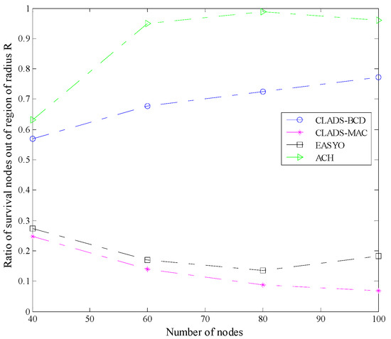 In Figure 3 and Figure 4, the ratios of survival nodes in and out of the region of radius are compared, respectively. From Figure 3 and Figure 4, we can see that ACH performed best most of the time. The reason is that under ACH, energy consumption is well balanced, due to the use of clusters. TDMA scheduling is also utilized in clusters to further reduce energy consumption. The ratios of survival nodes both in and out of the region of radius under CLADS-BCD were much higher than those under CLADS-MAC and EASYO. This implies that, for backpressure-style schemes, the network lifetime under CLADS-BCD is longer than that under EASYO and CLADS-MAC. The reason is as follows. Transmission powers of the nodes around the sink node are reduced through the utilization of distance coefficients for energy queues and distance coefficients for data queues in the CLADS schemes. Therefore, the average lifetime of nodes in the region of radius R under CLADS-BCD is greatly increased. CLADS also performs better than EASYO in reducing the energy consumption of nodes out of the region of radius R, through applying the normalization of queues in optimization framework. In addition, since CLADS-BCD is optimal and CLADS-MAC is sub-optimal in scheduling, CLADS-BCD performs better than CLADS-MAC.