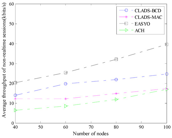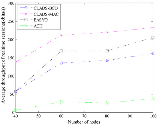 The average throughput of real-time sessions of different schemes is compared in Figure 5. The average throughput of real-time sessions under CLADS-BCD, CLADS-MAC, and EASYO all increased with the increase in the number of nodes. In Figure 5, we can see that average throughput of CLADS-BCD was lower than that of EASYO. ACH performed much worse than backpressure-style schemes. The average throughput of non-real-time sessions of different schemes is compared in Figure 6. In Figure 6 we can see that the average throughput of non-real-time sessions under CLADS-BCD, CLADS-MAC, and EASYO all increased with the increase in the number of nodes. Figure 6 also shows that the average throughput of CLADS-BCD was lower than that of EASYO, but higher than that of CLADS-MAC and ACH. The reason is as follows. Both the data transmission time and throughput under ACH were reduced, since TDMA scheduling was utilized in clusters. Since the weights of data queues in the optimization framework in CLADS-BCD were lower than those in the EASYO scheme, CLADS-BCD and CLADS-MAC performed worse than EASYO in average throughput. It should be noted that the average throughput of real-time sessions under CLADS-MAC was the highest. The reason is that in CLADS-MAC, using a distributed scheduling scheme, the nodes with more buffering packets could obtain more transmission opportunities. This means that CLADS-MAC is suitable for wireless multimedia ad hoc networks in which nodes are initialed with adequate energy.