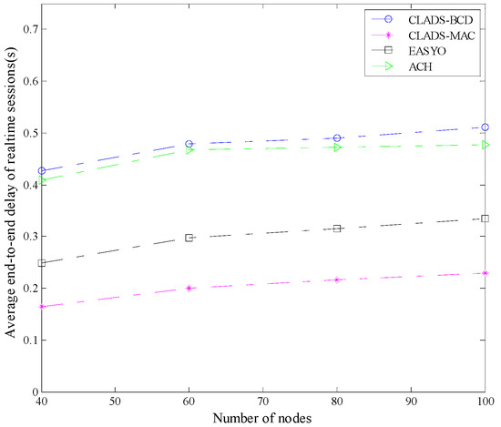Average end-to-end delay of real-time sessions under different numbers of nodes.
