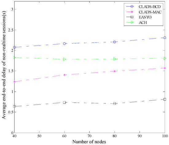 Average end-to-end delay of non-real-time sessions under different numbers of nodes.