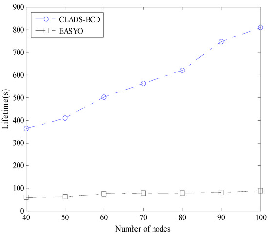 In Figure 9, network lifetime is compared. As shown in the figure, network lifetime under CLADS-BCD was much higher than that under EASYO. The reason is as follows. According to the characteristics of wireless sensor networks, CLADS-BCD adopts distance coefficients of energy queues in optimization to reduce the energy consumption of nodes in the area surrounding the sink node. This can prolong the lifetime of the nodes near the sink node, as well as increase the network lifetime.