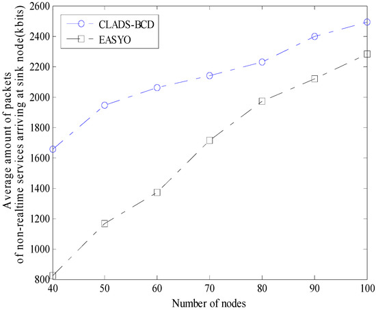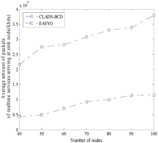 The average number of packets of non-real-time and real-time services arriving at the sink node are compared in Figure 10 and Figure 11, respectively. From these two figures we can see that, for both real-time service and non-real-time service, the number of packets arriving at the sink node under CLADS-BCD was higher than the number under EASYO. This implies that wireless sensor networks using CLADS-BCD can collect more information than networks using EAYSO. The reason is that the network lifetime of CLADS-BCD was much higher than that of EASYO. Thus, the sink node can collect data packets for a much longer time under CLADS-BCD than under EASYO.