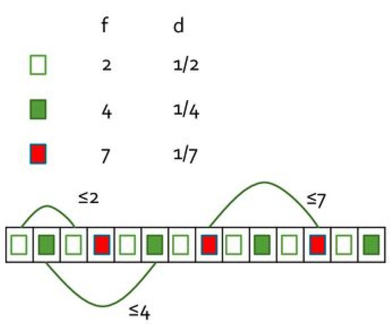 The Pinwheel problem [2] is defined as follows. Given a set , , …, of positive integers called Pinwheel frequencies, one is asked to create an infinite sequence S of indices drawn from the set 1, 2, …, n, such that, any sub-sequence of consecutive elements in S includes at least one index i. The density of set V is defined as and it is known that instances having density cannot be scheduled. An example of input instance for the Pinwheel problem is shown in Figure 1.