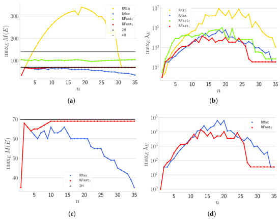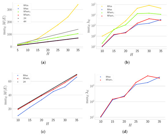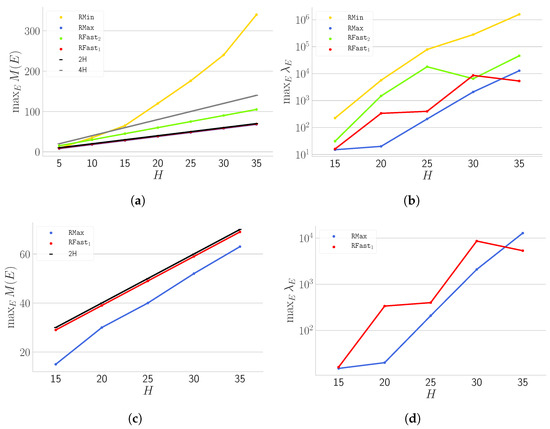 How maximum (a,c) and maximum (b,d) change as a function of H when instances are induced by all partitions of having cardinality . Panels (c,d) show strategies that, experimentally, exhibit 2-approximation.