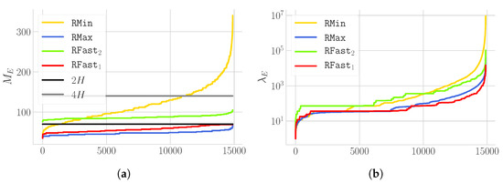 In the first set of experiments, parameter H was fixed and all possible input instances of n bamboos were considered whose growth rates sum up to H. Such instances were generated by considering, for a given , all integer partitions of H. Hence, clearly, the resulting n was in , where for there was only one bamboo having growth rate equal to H while for all bamboos had unitary growth rate (e.g., for , we had instances , and ). Note that, for H, values in the set were selected. This choice was dictated by the fact that the number of integer partitions, and therefore instances to consider, grows very quickly as H increases and hence too large values of H induce a computationally prohibitive number of simulations. In particular, it is known that the number of integer partitions of a natural number k grows asymptotically as as k approaches infinity [30]. For instance, p(100) = 190,569,292 while . Figure 2b provides an overview of the total number of inputs considered in this experiment. However, the trend of the obtained results does not seem to be affected for H growing.
