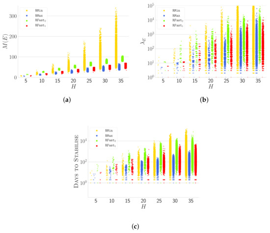 Distribution of values of: (a); (b); and number of days before stabilisation (c) as a function of H, for all considered strategies and instances.