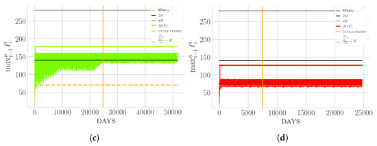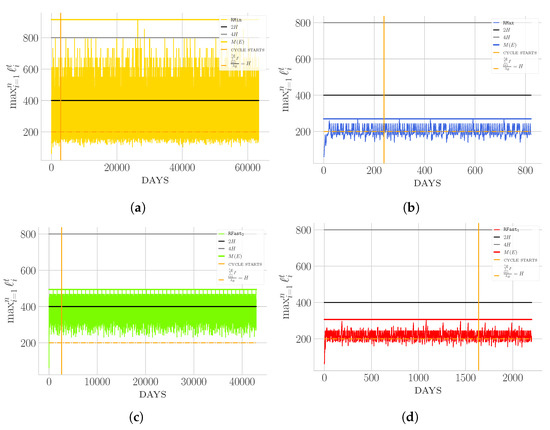 Snapshot of the evolution of maximum heights when strategies: (a); (b); (c); and (d) are applied on an instance having and . (in details, structured as follows ). On the x-axis the consecutive days are reported while on the y-axis the maximum height on the corresponding day is plot. The vertical line shows the beginning of the periodic phase while the horizontal lines show, respectively, (i.e., H), , , and over the entire execution.