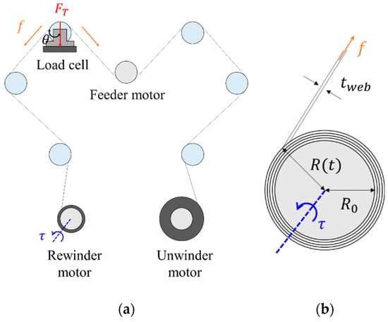 As shown in Figure 1a, the web is fed at a constant speed by the feeder motor and is wound with the proper tension by the rewinder motor. The web dynamics Equation (1) and roll-to-roll system dynamics model Equations (2)–(8) used throughout the paper are described in References [11] and [24]. The web can be represented in terms of spring and dashpot elements, which are described by the elasticity modulus E and the viscosity modulus . Lumped parameter models are expressed as the Kelvin-Voigt model for web dynamics. In the case of the Kelvin-Voigt model, the web tensile stress is expressed as follows: