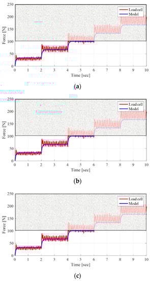 where is a time constant. The nominal model was obtained using an experimental method known as system identification, which develops mathematical models of dynamic systems from the measured input and output data of the system. The process of accurately obtaining a nominal model is important. Because the proposed KF in Section 3 and the tension controller, FF, and DOB in Section 4 largely vary in performance, depending on how accurately the nominal model is obtained, the experiment was carried out in three cases depending on the state of the film being wound. When step input with various magnitudes is applied to the system, the dynamic model is determined through the output data measured by the load cell. As shown in Figure 2, we focused on the characteristics of the system by 100 N because the experiment was performed from 0 N to 100 N.