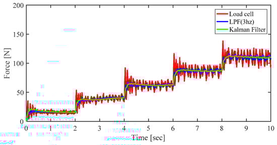 Figure 4 shows the load cell signal, the signal processed by the LPF, and the signal processed by the KF. Unlike LPF, which has a limitation in lowering the cutoff frequency due to the phase delay, the KF further reduced noise.