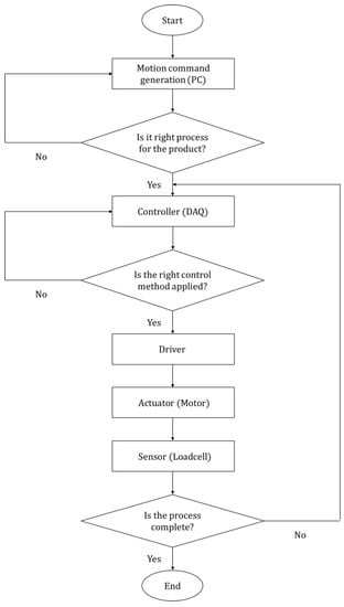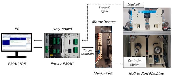 All experiments were conducted on the R2R system depicted in Figure 8 and the procedure was as follows. After fixing the web of the roll form to the rewinder motor, the load cell signal, which varies according to the rewinder motor torque, was controlled in real time by the proposed control algorithm. Then, the opposite ends of the web were fixed to the unwinder motor and the motor was controlled equally. Finally, the feeder motor, which operates only for web feed, was controlled at a constant speed by the proportional-integral controller. A Mitsubishi AC servo motor HF-KP43 and Mitsubishi motor driver MR-J3-70A were driven as rewinder, unwinder, and feeder motors. These were controlled in real time by a Power PMAC ACC 24E3 axis-interface board with 0.1-ms sampling time. The Power PMAC’s Integrated Development Environment (IDE) program includes the GNU compiler; thus, we designed the control algorithm with a C-based user code. Figure 8 and Figure 9 show the overall control system and program flow chart for the R2R system.