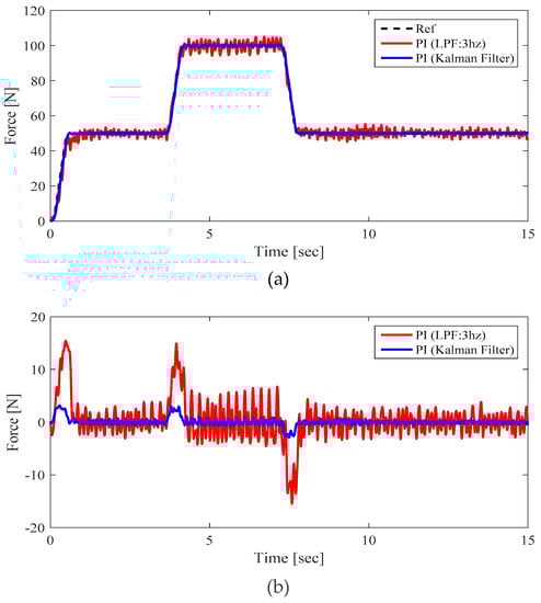 In order to evaluate the tension tracking performance of the proposed control scheme, experiments were carried out under the following conditions. The web was transported at a constant speed by the feeder motor and the tension command had a section varying from 0 N to 100 N. Figure 10 shows the experimental results for verifying the performance of the KF. As shown in Figure 10b, the tracking error could be reduced and the bandwidth could be increased when signal processing was performed with the proposed KF relative to the LPF, which is a conventional signal processing method in R2R systems.